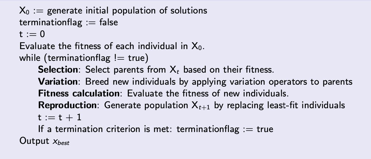 - fitness (objective) function: to evaluate solutions 適應度(目標)函數:評估解決方案